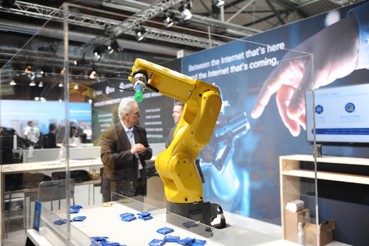 这是2月19日在德国柏林拍摄的“互联世界”物联网大会国际展商的展台。