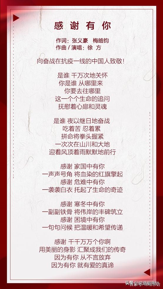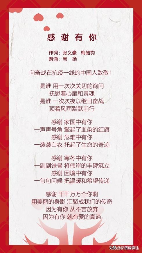 ? 疫情就是命令,防控就是责任。抗疫诗词《感谢有你》由国务院国资委新闻中心副主任张义豪主创和作词,湖北籍青年词作者梅皓钧协助创作,为电影《厉害了,我的国》解说配音的著名艺术家周扬朗诵,国家级美声独唱演员袁艺担任艺术监制,音乐人徐方作曲及演唱。该首诗词用深情激昂、富有感染力和穿透力的笔调讴歌了奋战在抗疫一线的中国人,饱含着满满的正能量,展现出中国精神、中国道路、中国力量的伟大。据悉,该首诗词在中央宣传部“学习强国“平台等平台发布后,引起广泛关注,新华社客户端/国新办中国网/央广网/环球网/搜狐/今日头条/喜马拉雅/港澳及各地100多个平台竞相转发,好评如潮。