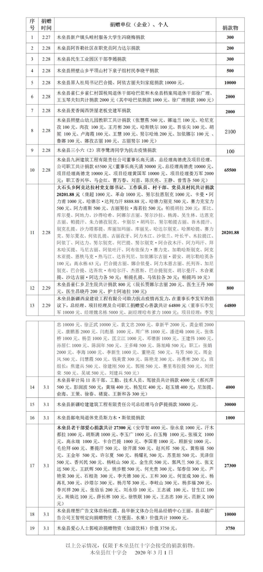 截止3月1日18:00时,木垒县红十字会接收捐款、捐物情况公示如下:2月27日-3月1日捐款捐物:金额(元)