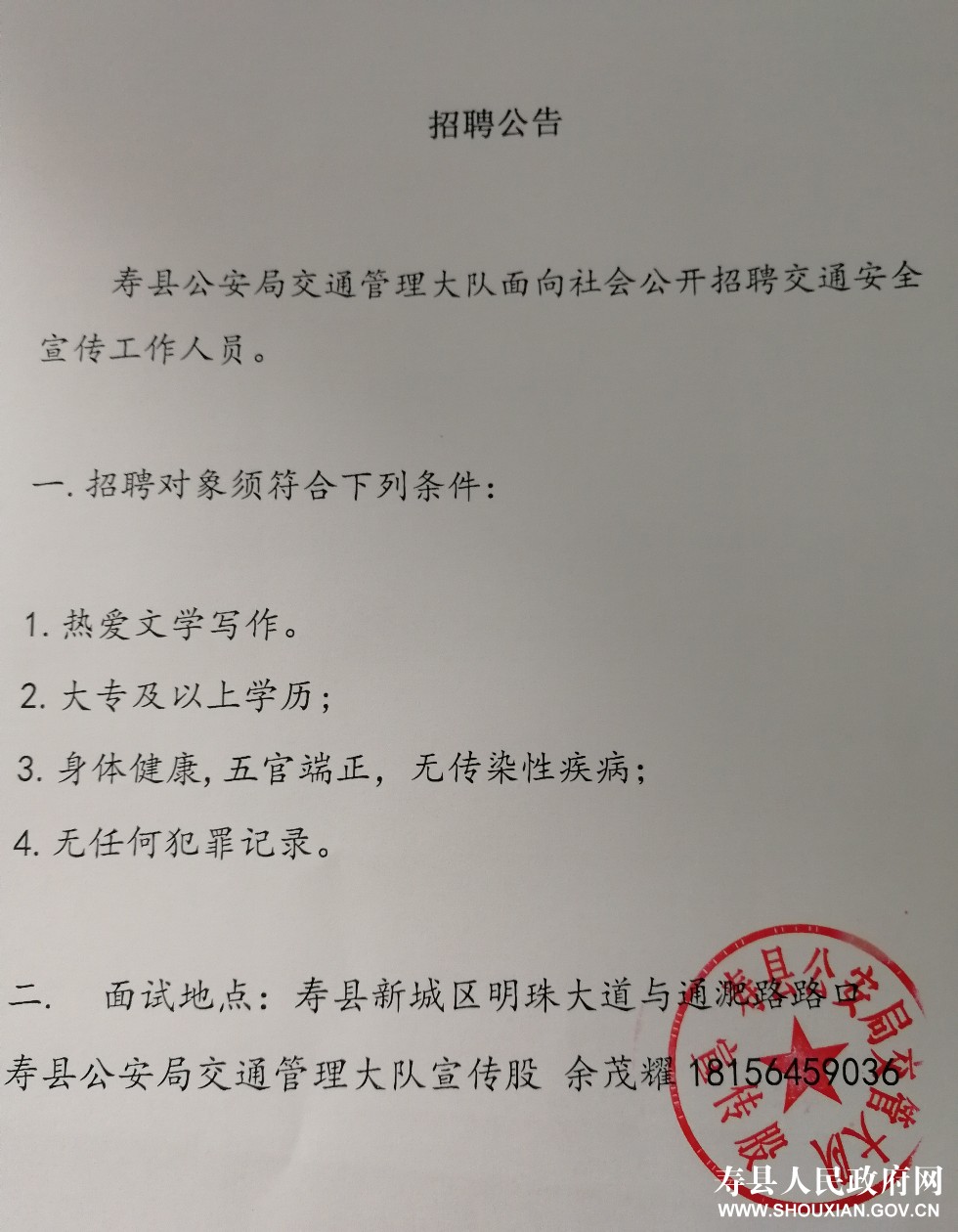 寿县公安局交通管理大队招聘交通安全宣传工作人员公告