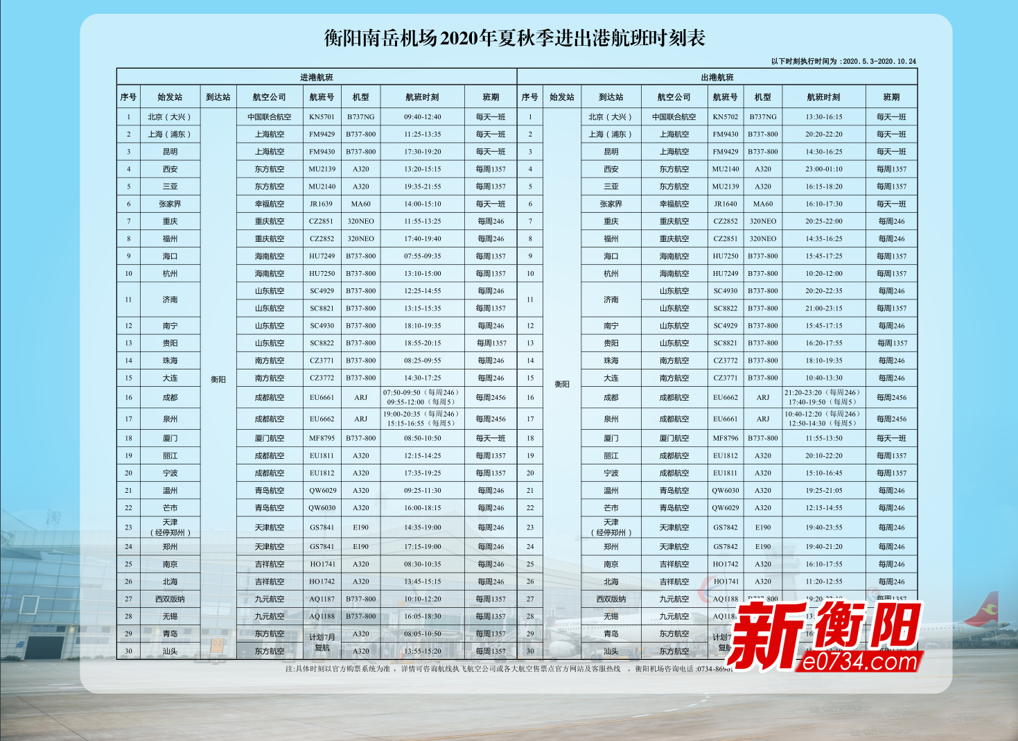 4月27日,记者自衡阳南岳机场获悉,自5月3日起,南岳机场开始执行2020年夏秋季航班计划,换季后共运营航线17条,通达国内30个城市。
