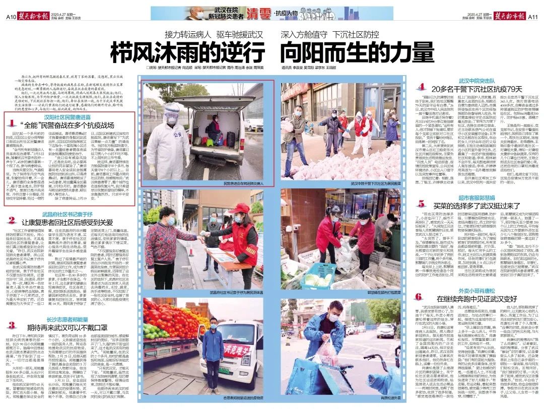 4月27日,《楚天都市报》推出10个整版策划报道,其中抗疫人物版特别报道了汉阳区琴断口街派出所社区民警唐进喜的事迹。45岁的唐进喜忙转运,进方舱,下社区,勇敢逆行,奔忙在抗疫各大战场。