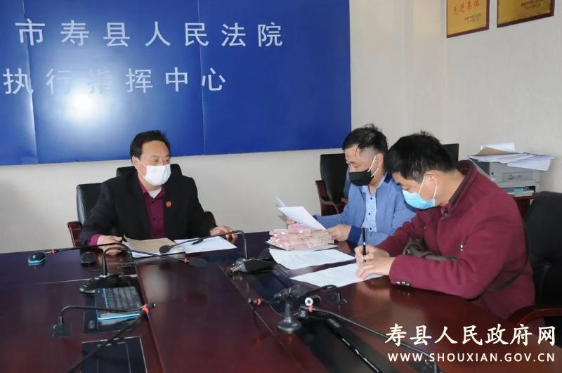 4月23日,寿县法院执行指挥中心,在承办法官的倾力调解下, 14名工人的代表徐某与安徽某公司达成分期还款和解协议,徐某拿到了首批到位的工人工资14万元。