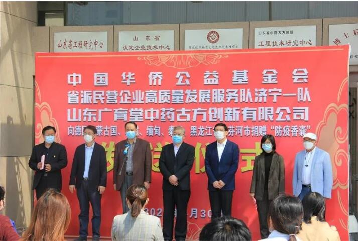 30日上午,中国华侨公益基金会、省派民营企业高质量发展服务队济宁一队、山东广育堂中药古方创新有限公司捐赠“防疫香囊”发送仪式举行。省委统战部副部长、省派民营企业高质量发展服务队济宁一队队长李法信,市委常委、统战部部长白山参加活动。