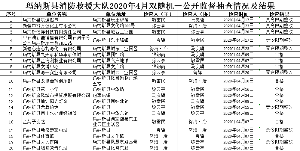 玛纳斯县消防救援大队2020年4月双随机一公开监督抽查情况及结果