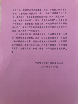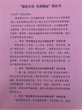 倡导绿色生活、反对铺张浪费,是现代社会文明的重要标志,是群众性精神文明创建活动的重要内容,也是推动社会主义核心价值观落地生根的必然要求。5月19日,区委办公室来到结对包保村——涂家垴镇公友村,开展“倡导绿色生活,反对铺张浪费”活动,首先,区委办公室干部深入村塆,逐户发放“绿色生活,从我做起”倡议书,引导广大村民培育绿色生活方式,树立生态文明意识。