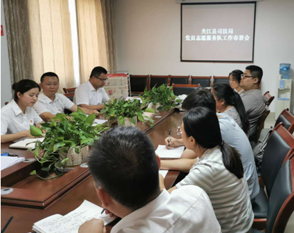 授旗仪式结束后,全体志愿者来到县司法局会议室参加党员志愿服务队工作部署会,会上,黄永进书记强调,今年是“七五”普法收官之年,党员志愿者服务队要要结合实际工作,结合群众需要有计划的开展工作,要提高站位,在践行法治中坚定方向,志愿者们要提高认识、担起责任,增强做好志愿服务工作的责任感和使命感,要发挥自身法律优势,把服务真正落实到解决实际困难和满足群众的需求上来。在服务大局中要彰显价值,以建设法治夹江,建设和谐、健康、文明的社会环境为使命,用法律人的力量为夹江经济社会健康发展保驾护航!