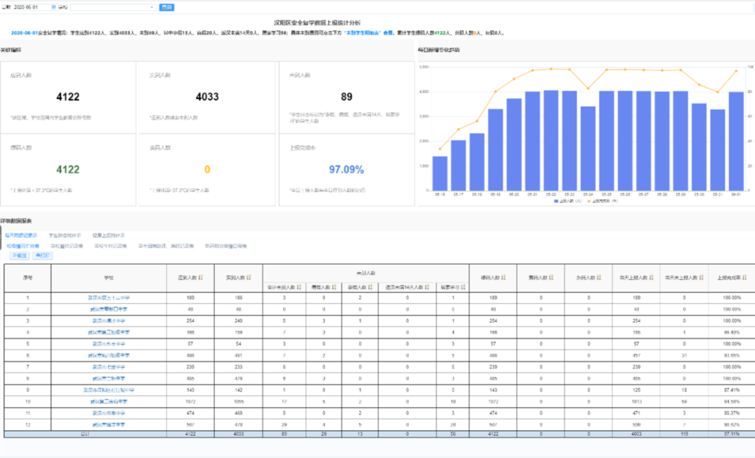 汉阳区教育局相关负责人表示,“自高三复课后,学校反映每天要填写不少健康数据。班主任、校医、区教育局、市教育局层层上报,工作量比较大。利用信息技术平台,能自动生成日报,实时更新,具体信息一目了然。”
