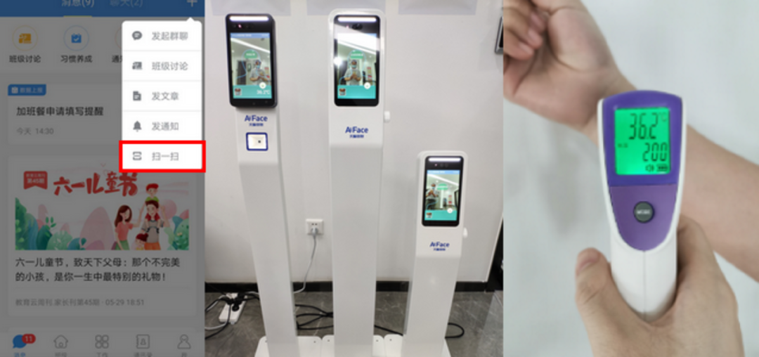 在校内“晨午检查”时,教师可以通过手机扫码上报、联网额温枪扫码上报、联网人脸测温仪上报、人人通空间APP教师代报等形式在教育云平台上报学生健康信息。