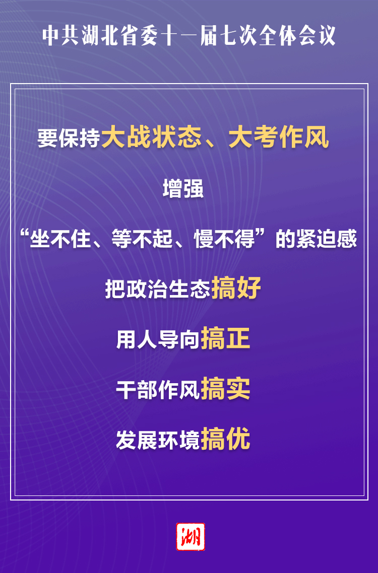6月10日,湖北举行省委十一届七次全会,会议强调,当前湖北各方面工作任务很重、困难很多,全体干部要保持大战状态、大考作风,真抓实干、奋力拼搏,坚决完成好各项工作任务。