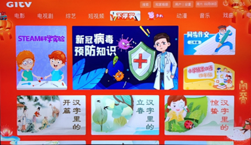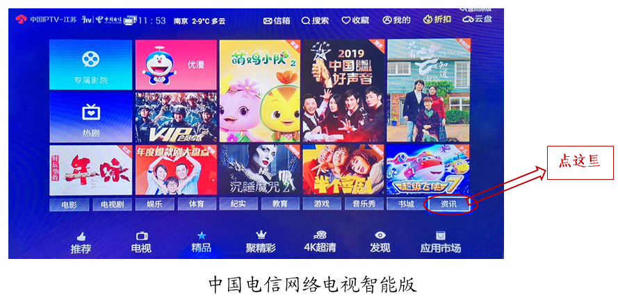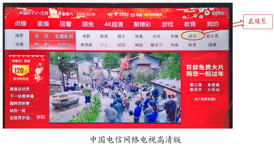 安装了中国电信网络电视的家庭,也可以通过电视进行学习,使用办法是,在电视界面首页点击“资讯”栏目,进入栏目,使用遥控器选择“空中课堂”,点击“确定“按键,进入专区进行课程点播学习。
