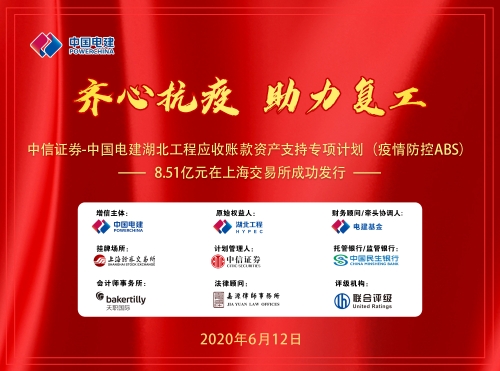 6月12日,“中信证券-中国电建湖北工程应收账款资产支持专项计划(疫情防控ABS)”在上海证券交易所成功发行,产品发行规模8.51亿元,期限3年,湖北工程公司为发行主体,电建基金公司为牵头协调人和财务顾问,该产品募集资金专项用于湖北工程公司的疫情防控和复工复产工作,加大对湖北企业的金融支持力度。