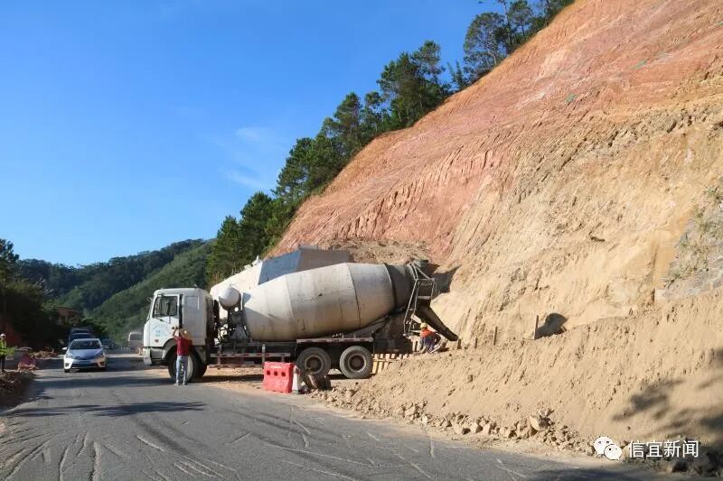 ▲省道352线贵子镇绿湖村山体滑坡易发路段正在加紧施工筑护坡。