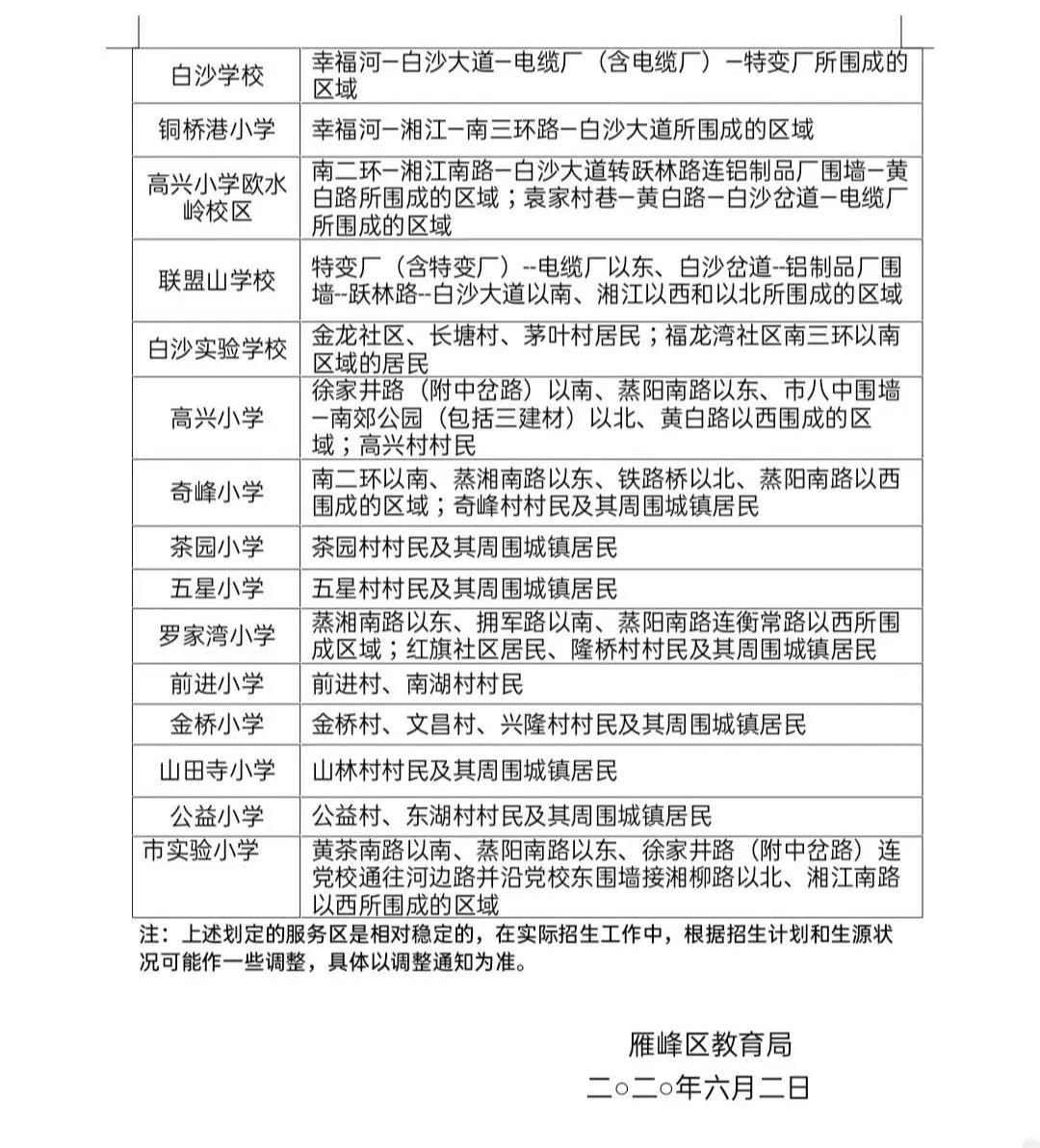 草后街小学:五一路以东、电厂(含电厂)以南、湘江河以西、草桥以北所围成的区域。