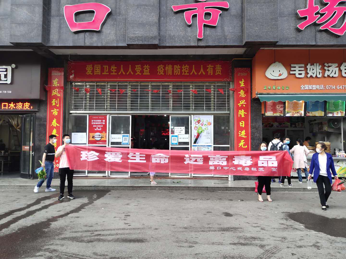 活动中,樊口中心戒毒社区工作人员及志愿者向过往群众、辖区临街店面发放禁毒宣传单共计600余份。