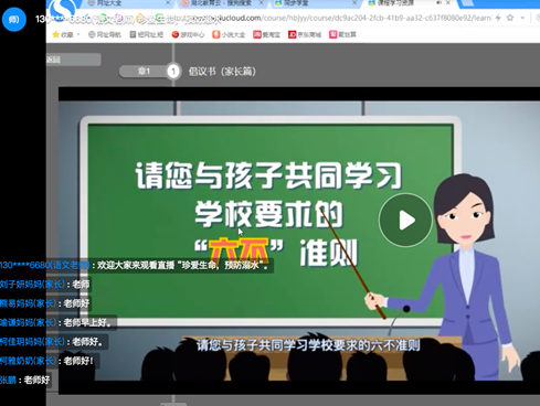 2020年6月15日,该校开展了以“珍爱生命?预防溺水”为主题的大型活动。校长袁燕花亲自在全校五个班进行群联播,在网上召开了“珍爱生命,预防溺水”主题班会,要求每个学生至少有一位家长陪同参加活动。家长们踊跃参与,积极互动,纷纷表态要全力配合学校把好防溺水的安全之门。