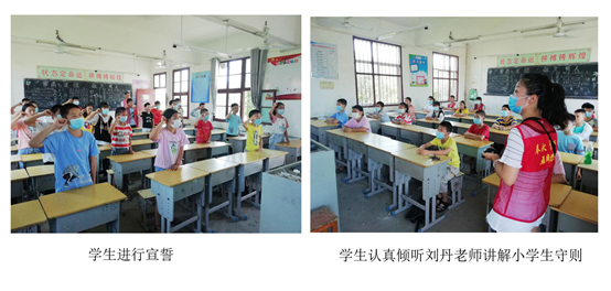 六年级班主任刘丹老师首先向学生详细讲解了小学生守则每一条的具体内容,接下来根据学习和生活实际,让学生对学习和生活中容易碰到的不文明、不道德的行为结合守则发表自己的看法,学生们都积极发言,也有不少学生反省了自己的不文明行为;随后通过激烈的知识竞赛活动调动学生的积极性,使学生进一步加深了对守则的理解和认识;最后在夏博康同学的带领下,全体同学进行了宣誓,他们承诺以后一定努力规范自己的言行,认真遵守小学生守则,做一个遵纪守法的人。