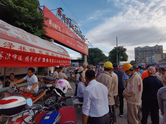 ? 为深入贯彻落实《保障农民工工资支付条例》,进一步增强广大农民工的法治意识和疫情防控意识,切实发挥工会在构建和谐劳动关系、维护进农民工队伍和社会稳定中的积极作用。6月17日上午,市总工会党组成员、副主席张先驰,权益保障部部长马祥来,职工服务中心彭如山,区总工会党组书记、副主席洪春娥一行在泽林农民工劳务大市场开展“尊法守法·携手筑梦”服务农民工公益法律服务行动。?