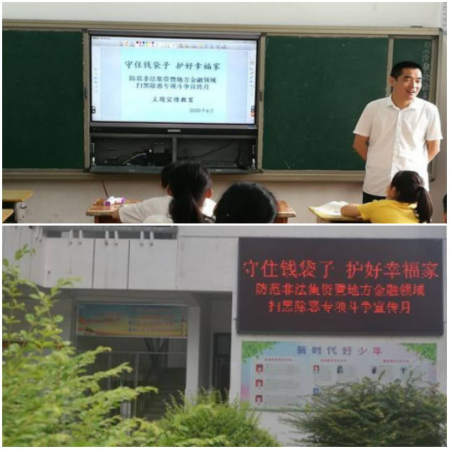 本活动期间,辖区学校也积极参与,电子屏持续滚动播放宣传标语,提醒学生家长及学校周边的老百姓要珍惜一生血汗,远离非法集资,积极提供扫黑除恶问题相关线索。