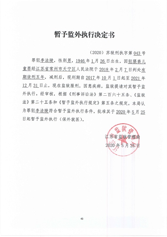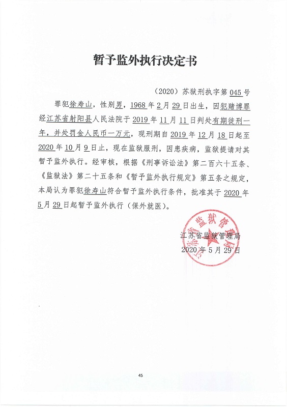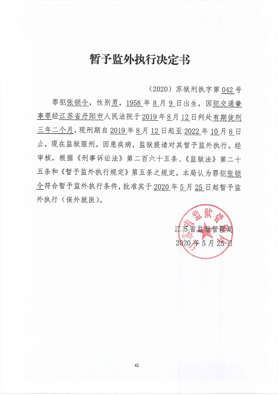 暂予监外执行决定书(2020)苏狱刑执字第42-45号