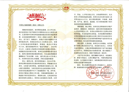 感谢信中指出,2014年以来,在中国电建各项扶贫措施助力下,剑川县实现4个贫困乡镇、46个贫困村脱贫出列,贫困发生率由20.18%降至0.86%,群众认可度达到98.72%,脱贫成效被评价为“稳定可持续”。
