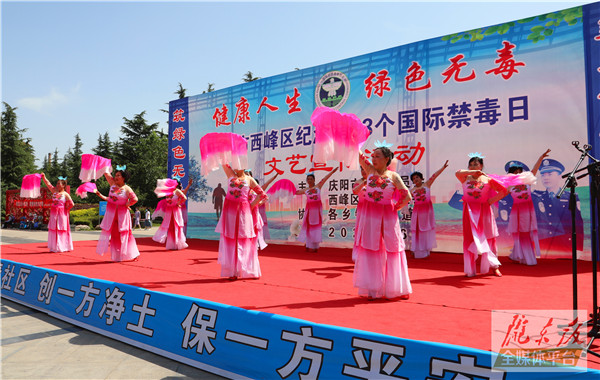 在第33个国际禁毒日来临之际,6月24日,由市禁毒委员会和西峰区禁毒委员会共同主办,以“健康人生 绿色无毒”为主题的纪念第33个国际禁毒日文艺宣传活动在西峰区东湖公园西门广场举行。