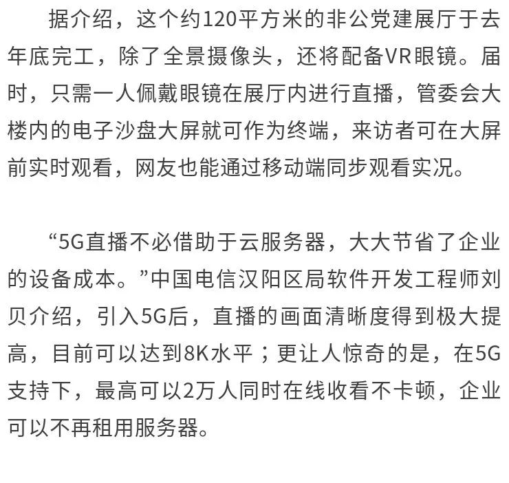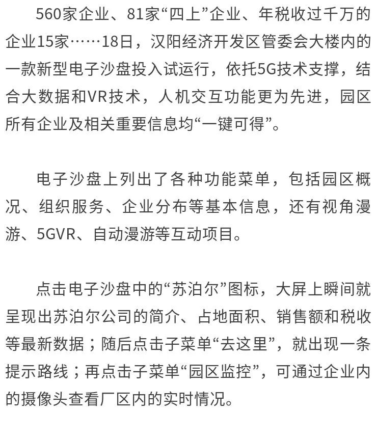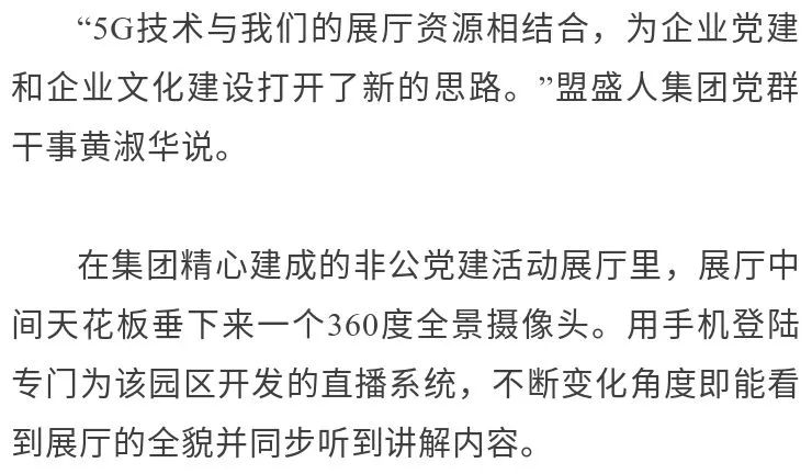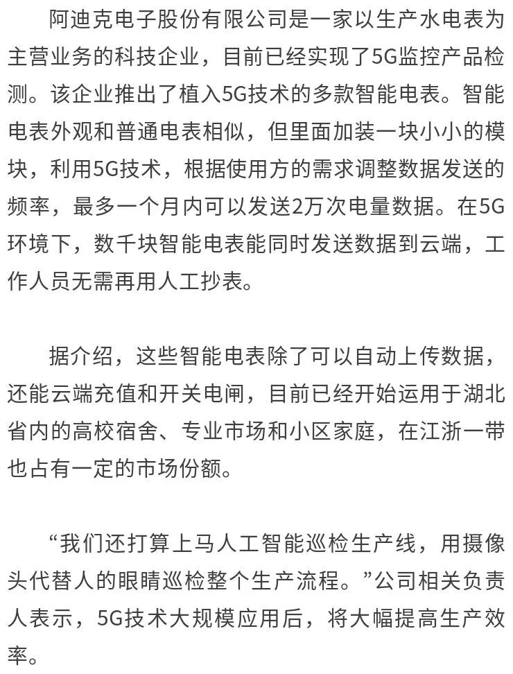 来访者通过人机互动可以很轻松找到自己想要的信息 5G提速电子沙盘,园区情况“一键可得” 车间天花板上安装的5G摄像头可以实现远程监控生产情况 不用增设服务器,2万人实时看直播不卡顿 依托5G,市民在手机端就可以实时参观盟盛人的展厅,并在线参加活动 电表实时上传数据,后台实现“云抄表” 植入了5G支持智能模块的电表可以实现“云抄表”