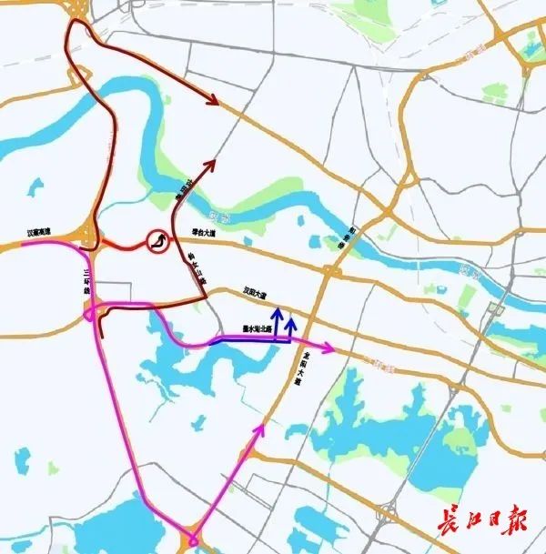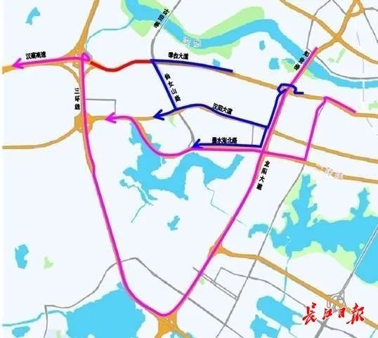 原二环线方向通过琴台大道往汉蔡高速的车辆可提前通过龙阳大道地面层绕行汉阳大道、墨水湖北路,经三环线地面层上汉蔡高速,或直接通过龙阳大道高架绕行三环线、汉蔡高速。