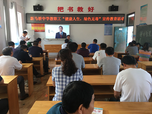 2020年6月30日上午,固镇县新马桥中学举行禁毒宣传教育活动,总务主任苏加生利用晨会时间向全体教职工强调了毒品的种类及其危害,并带领大家一起观看了由钟南山,李兰娟、张文宏主讲的毒品危害视频。校长孟现全强调,毒品是社会的毒瘤,全体师生一定要拒绝毒品,自觉抵制毒品。