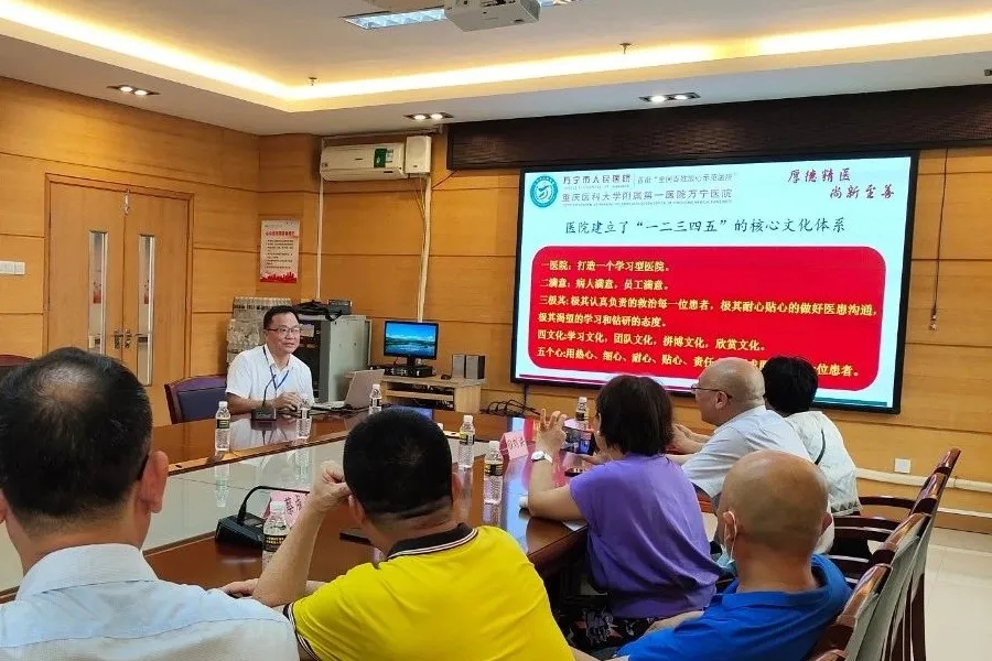 陈吴荣院长向大家介绍了我院的院区建设与整体布局,并一同参观了院内的党建文化长廊。着重介绍了我院的核心文化体系、党建引领医院发展及打造学习型医院文化板块,通过图文并茂的方式展现出医院创新党建工作,全院职工积极向上、勤思善学的良好学习氛围及优秀的医院职工文化。