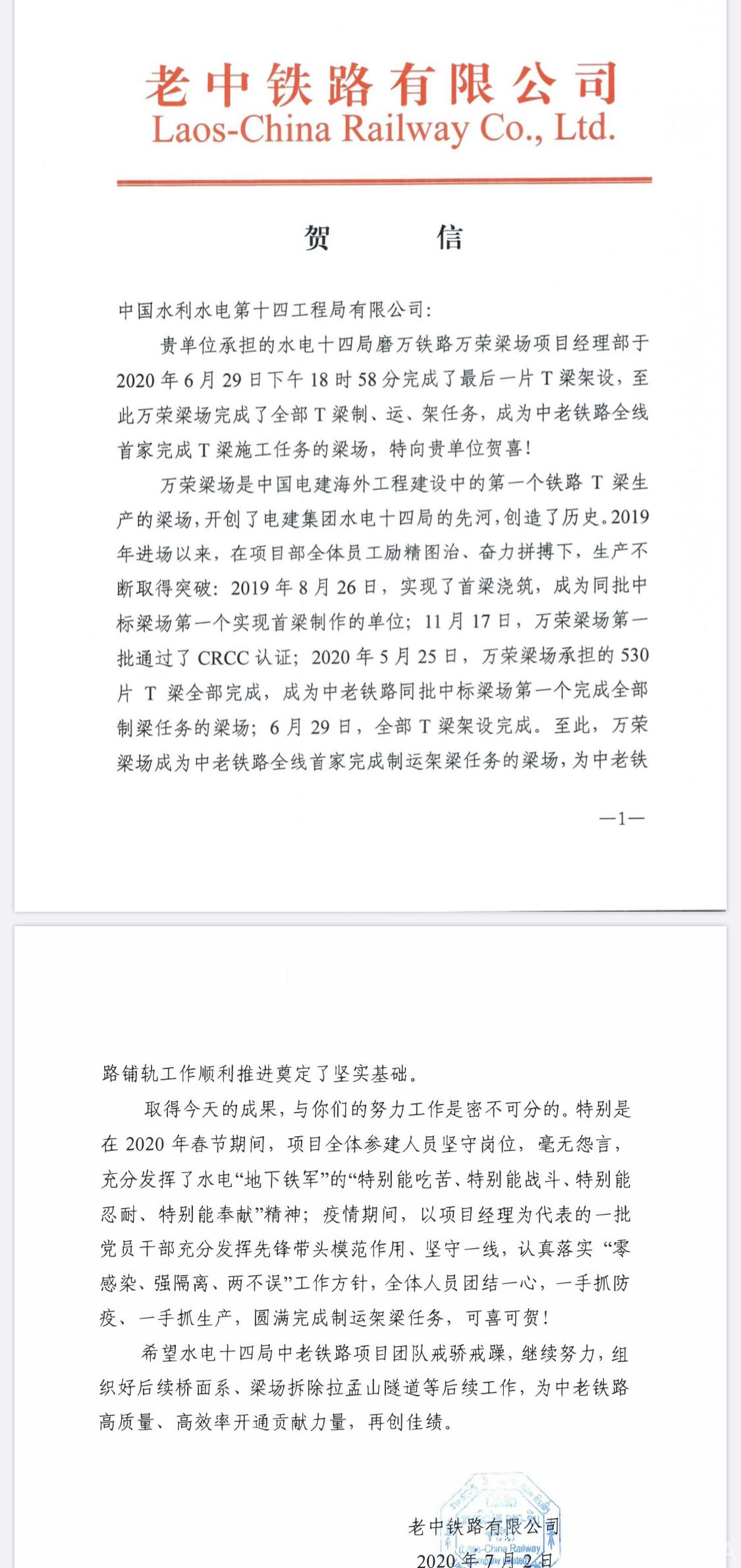老中铁路公司发来感谢信:万荣梁场率先全线完成T梁施工任务