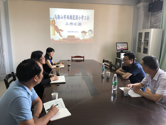 7月3日上午,花山区工会主席谢亚新到西湖花园小学调研工会工作,区教育局党委书记窦宜胜陪同调研。
