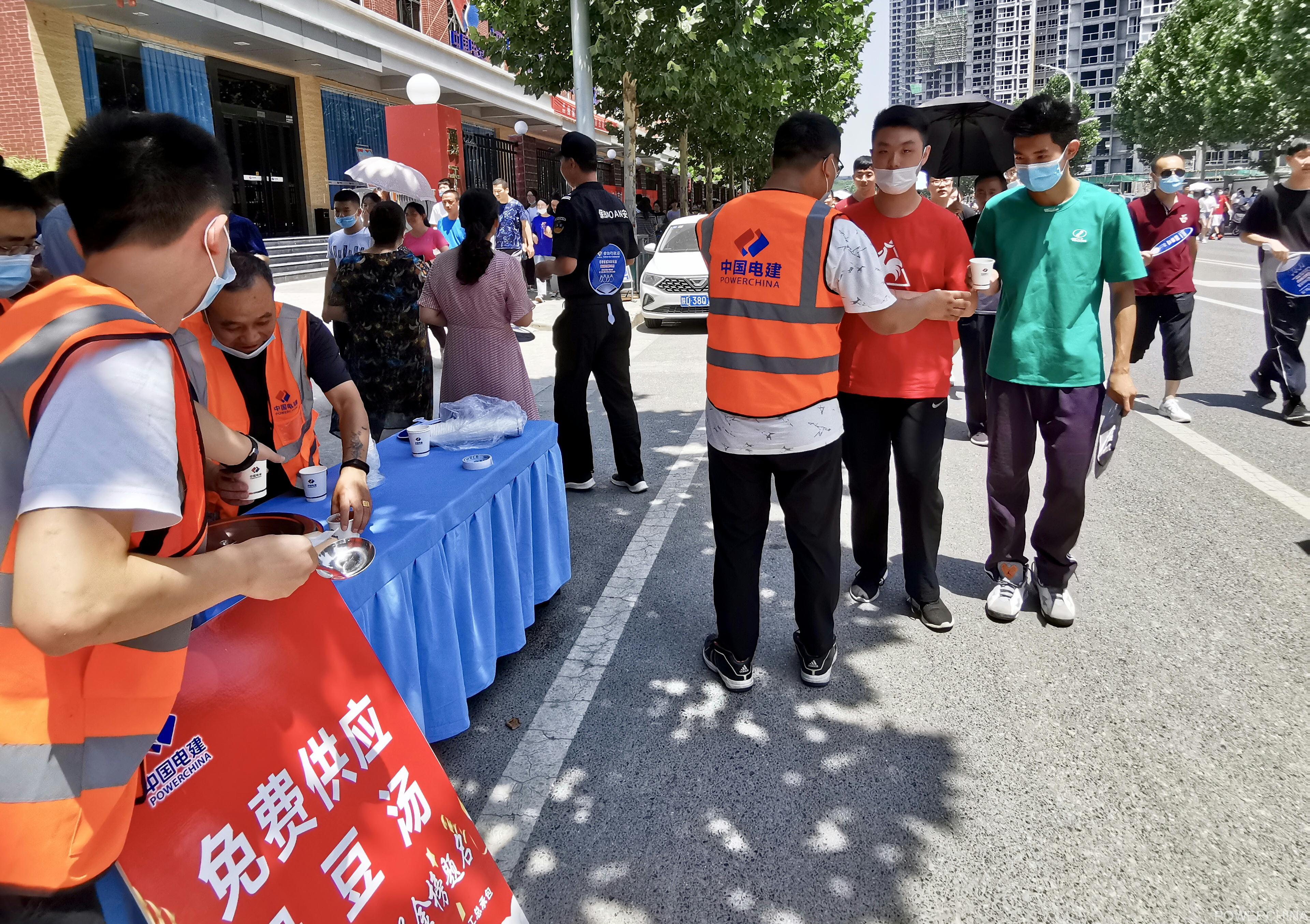 在温江中学考场外,水电七局志愿者在温江中学考场外开展爱心助考活动,为考生、家长、交警、协警以及考场外的工作人员等送去矿泉水和藿香正气液等防暑物资。在西安地铁项目部,水电三局、水电八局的志愿者开展“助力高考送清凉”志愿活动,在项目部正门前设立小方桌,免费为考生、家长及保驾护航的交警们提供清凉可口的绿豆汤,在炎热而又紧张的夏日中送去了关心和丝丝清凉。
