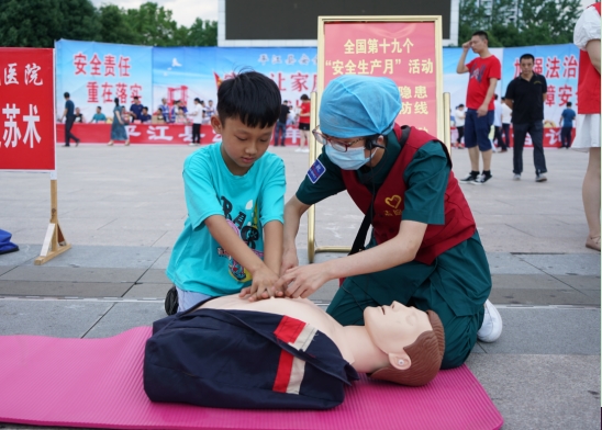 平江县红十字会组织志愿者通过悬挂横幅、陈列展板、设立专家咨询台、赠送小礼品、发放宣传资料等方式,向现场群众广泛宣传应急救护和健康知识,县卫健局、第一人民医院、第四人民医院、妇幼保健院、城关三阳卫生院志愿者队伍组织开展“心肺复苏”急救模拟演练,医护人员对心肺复苏处置步骤进行了详细讲解,并利用人体模型,示范了从判断意识、高声呼救、清除呼吸道异物、心肺按压、人工呼吸等心肺复苏步骤以及控制要点。