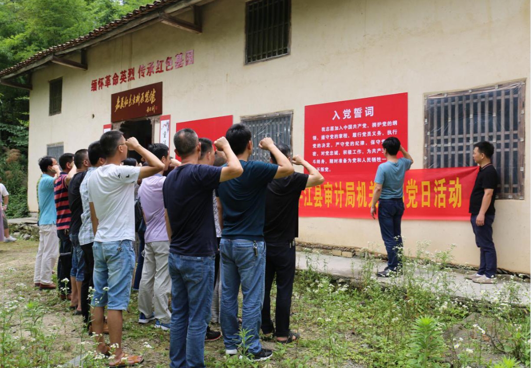 下午,审计干部们来到纯溪月光岩湘鄂赣省委、红军游击队驻地旧址参观学习,重温红色岁月,牢记初心使命。在加义红色史料展览馆门前,全体党员面向党旗,高举右拳,重温入党誓词,字字铿锵有力,句句掷地有声,表达出自己对党和人民的绝对忠诚与无限热爱。