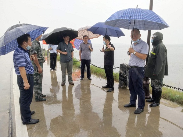 (本网讯)7月11日上午,国家防汛指挥部领导到广家洲大堤小南湖段3号哨棚检查指导防汛工作,市委副书记、市防汛指挥部副指挥长熊明新陪同检查。