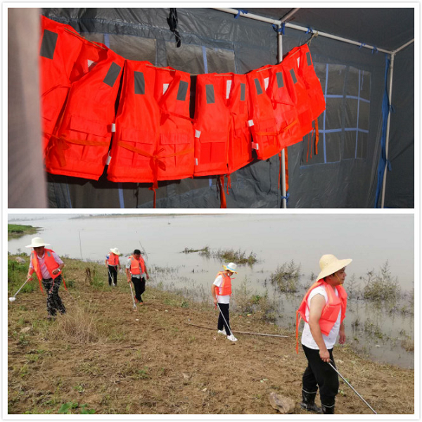 (本网讯)为确保防汛工作人员的人身安全,7月10日,太和镇对全镇22个哨棚全部配备救生衣,每个哨棚配备5件,巡堤人员在做好安全防护措施的情况下进行巡堤、清渣除障。