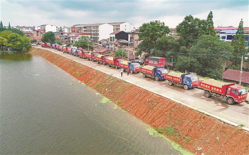 7月11日,华容县华容河潘华大桥西侧大堤上,“以车代仓”应急抢险车队严阵以待。为了有效提升全域防汛应急抢险工作能效,该县从去年开始试行“车船代仓”新模式,将以往定点储存的防汛物资装船上车,提升了调运机动性。 湖南日报记者 徐典波 通讯员 吴巍伟 摄影报道