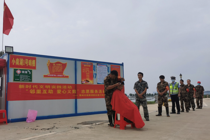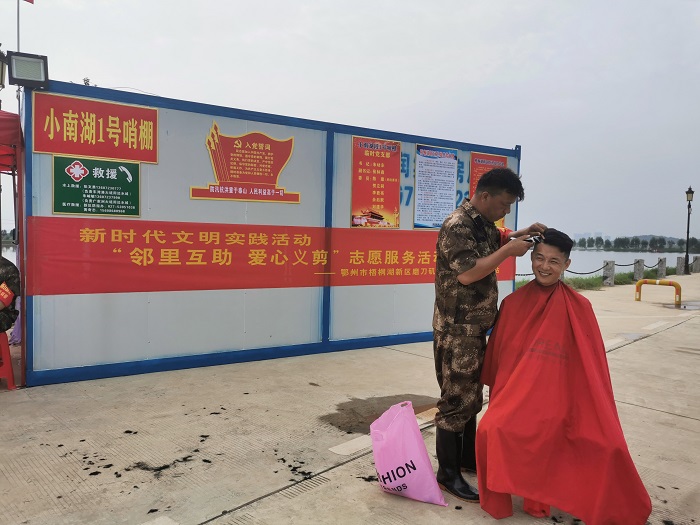 这是2020年7月13日上午八点,发生在广家洲大堤南湖堤防汛哨棚内的一场对话。当日下午四点,一场主题为“邻里互助爱心义剪”的志愿服务活动就在南湖堤1号哨棚开展了。原来,梧桐湖新区磨刀矶村文明实践站了解到村民们为参加一线防汛,无暇顾及疯长的头发,立马就开始征集志愿者,组织志愿者。广家洲大堤南湖堤1号哨棚防汛队员陈绍军就是其中的一名义剪志愿者。