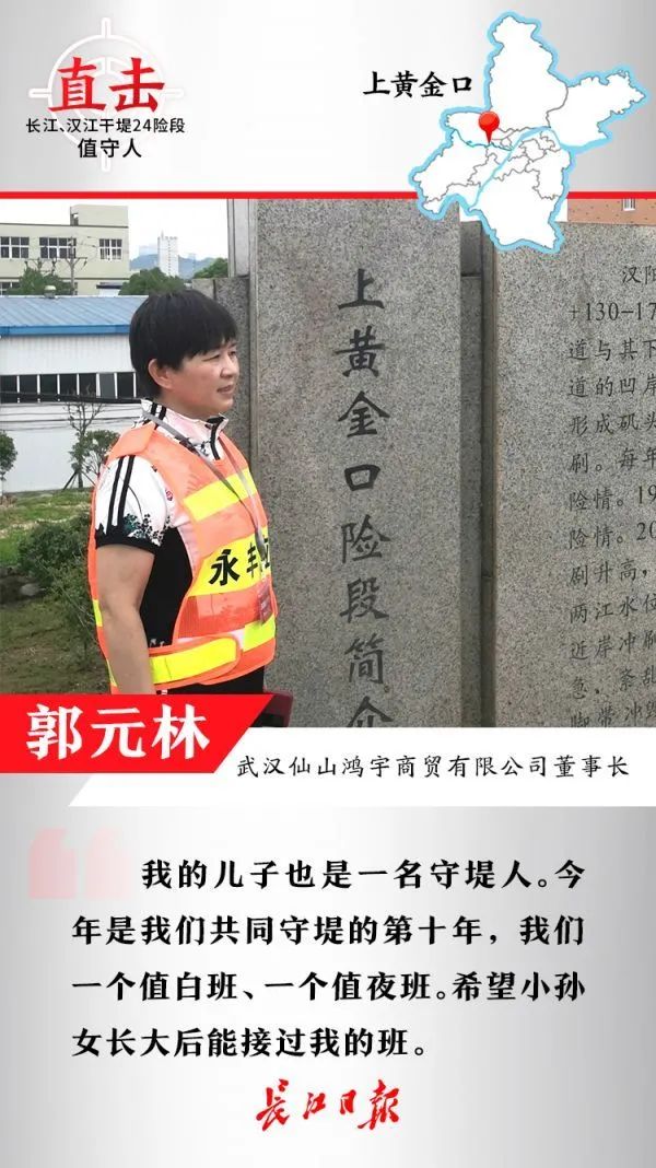 武汉仙山鸿宇商贸有限公司董事长郭元林介绍,我从1999年起,就带领汉阳区永丰街原仙山村的女子防汛突击队辗转值守汉江多段堤防。沿河堤上黄金口险段原来是土堤,曾出现过多次管涌险情。近十年来,汉阳沿河堤防加固加宽、河道畅通,岸坡再没有出现过“鼓泡泡”的情况。