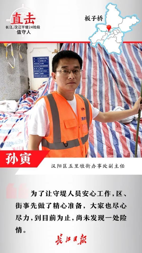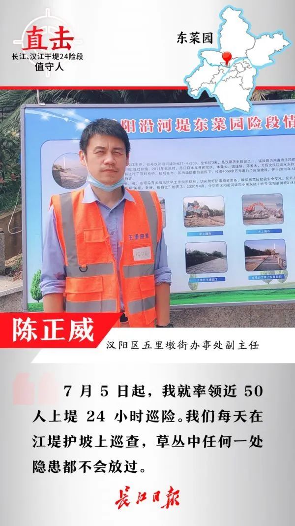 7月5日起,我就率领近50人上堤24小时巡险。随着水位上涨,沿江堤已被淹没,我就每天带人在江堤护坡上巡查,重点检查有无渗水等隐患,草丛中任何一处隐患都不会放过。现在的条件比以前好多了,防汛棚变成了集装箱活动房,防汛装备也得到了更新,大家都有信心守好大堤。