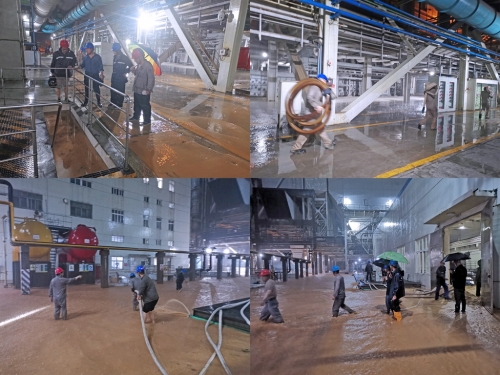 7月9日,伴随着轰鸣的雷声,江西吉安市突降暴雨,暴雨造成吉安市华能井冈山电厂严重积水,积水深达半米之多,现场一片“汪洋”,给机组安全稳定运行带来严重威胁。 汛情就是命令,为有效应对灾情,山东电建一公司检修运维公司井冈山维护项目部第一时间启动防灾防汛应急预案,项目经理李存鑫亲自带队,组织项目部120余人,以最快的速度投入到防汛救灾工作中,抢险人员分成10个小组,利用提前准备好的抽水泵,对汽机房、水泵房等低洼处进行排水,在厂区内利用防汛沙袋搭设临时泄洪渠道进行泄洪,并利用防雨布对配电柜等电气设备进行重点防护。全体人员冒着暴雨,连续奋战12个小时,顺利排除洪水险情,保障了井冈山电厂机组安全运行。