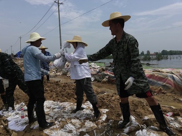 “我不累,还能继续,大家一起加油。”7月17日,烈日当空,天气异常炎热,在三山湖黄泥洲大堤小口子险段,杜山镇正组织机关干部在整险加固,一个单薄的身影顶着烈日伫立在大堤泥泞的堤岸上,正与其他男同事一起传递防汛土包,面对大家让她休息的建议,额头布满汗珠的她毅然拒绝,眼神里多了几分坚韧。