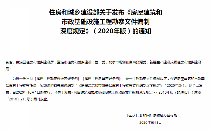 近期,住建部发布了《房屋建筑和市政基础设施工程勘察文件编制深度规定》(2020年版),自2020年10月1日起施行。《关于发布<房屋建筑和市政基础设施工程勘察文件编制深度规定>(2010年版)的通知》(建质〔2010〕215号)同时废止。