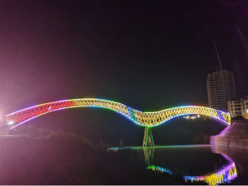 别具匠心的造型、璀璨的灯光、五彩斑斓的色彩,如意桥宛如一条巨龙盘旋在小通江河上,为通江县增添了一道亮丽的风景线,成为颇受当地年轻人追捧的网红景点。如意桥是一座异形钢桁架人行景观桥梁,总跨度138米,连廊宽度4.5米,是施工环境最复杂、技术难度最大、质量控制最严格、安全风险最高的单位工程。为保障如意桥照明效果,连日来,项目施工人员在伏天气候炎热、室外温度较高等恶劣施工条件下,严密组织,科学施工,顶烈日、战酷暑,不怕疲劳,连续奋战,最终高标准、高质量、安全高效地完成如意桥照明工程安装任务,为高明湖项目的整体推进打下了基础。