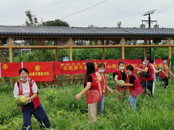 (本网讯)7月21日上午,太和镇农科村扶贫产业基地正值西瓜收获之日,由于当前防汛正当时,为缓解村基地瓜农收瓜压力,经太和镇创城办与农科村沟通协调,于今日联合镇妇联、团委组织镇、村志愿者,依托太和镇农科村新时代文明实践站开展“志愿服务助扶贫 爱心清凉进哨所”志愿服务活动。
