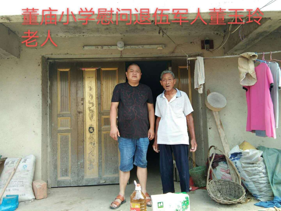 ? 7月24日上午,董庙小学冯校长、张主任带着油、面和奶等慰问品到服役军人蔡理想和董玉玲家中送去问候。冯校长表示:“拥军优属 拥政爱民”是我党、军队和全国人民的共识,是我们的优良传统,需要继续发扬光大,时值中国人民解放军建军93年之际,关爱军人是我们应尽的义务。
