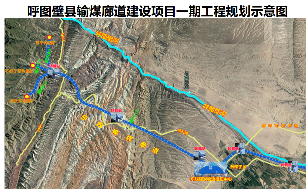 一期输煤廊道全长35公里,是全封闭带式输送,钢制栈桥长度达17公里,隧道长度1公里,输送带宽1.2米,设计输送能力1350吨/小时,年运力700万吨,东线由信发东沟煤矿、石梯子西沟煤矿、苇子沟煤矿至石梯子乡的煤炭物流枢纽,通过转运站给廊道的输煤皮带,实现三个煤矿煤炭分时段、点对点运输。