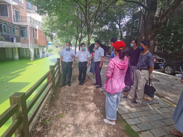 熊金林一行到现场实地查看,然梦园小区管理处项目经理邵义文介绍景观池塘污水有关情况。景观池塘位于然梦园小区三期范围内,于2018年建成,上建有一栋楼房两个单元,业主24户。其中部分业主将生活污水直接排放到池塘里,且池塘水为死水,日积月累,异味难味,再加上业主反映屋内潮湿有霉味,已成为困扰附近居民生活的大问题。