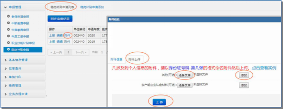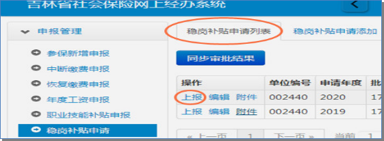 4.点击“稳岗补贴申请列表”,获取申请列表,点击“附件”,上传相关材料,“上传”后,点击“上报”。申请成功后,点击“同步审批结果”,即可查看网上申请是否审核通过,并可对“审批未通过”的申请进行修改或删除。